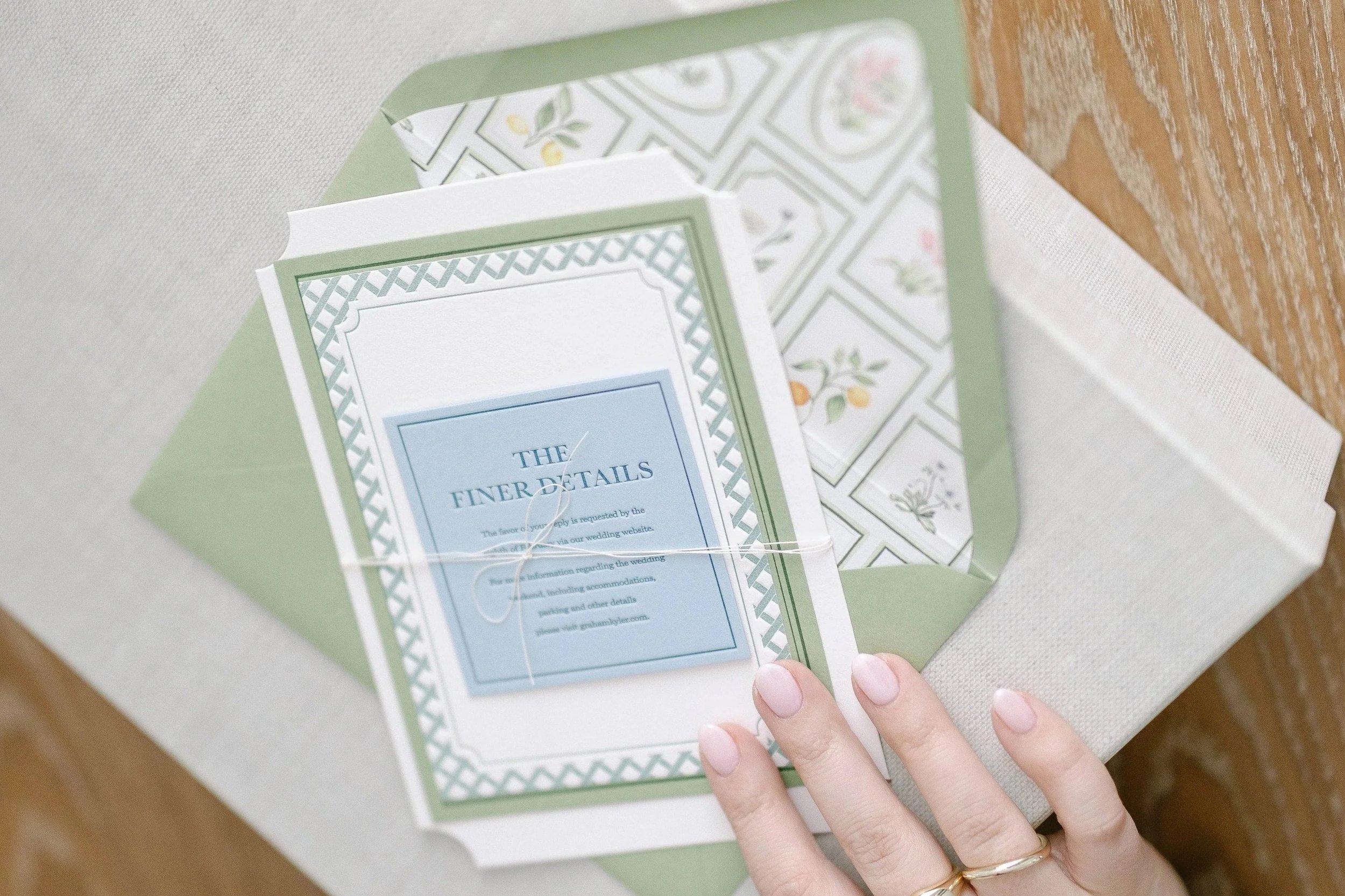Premium enhancements — such as specialty papers, letterpress or other elevated printing methods, watercolor illustrations, additional suite pieces, and curated embellishments like envelope liners, wax seals, silk ribbon, or belly bands — are available as optional upgrades to create a truly one-of-a-kind presentation.